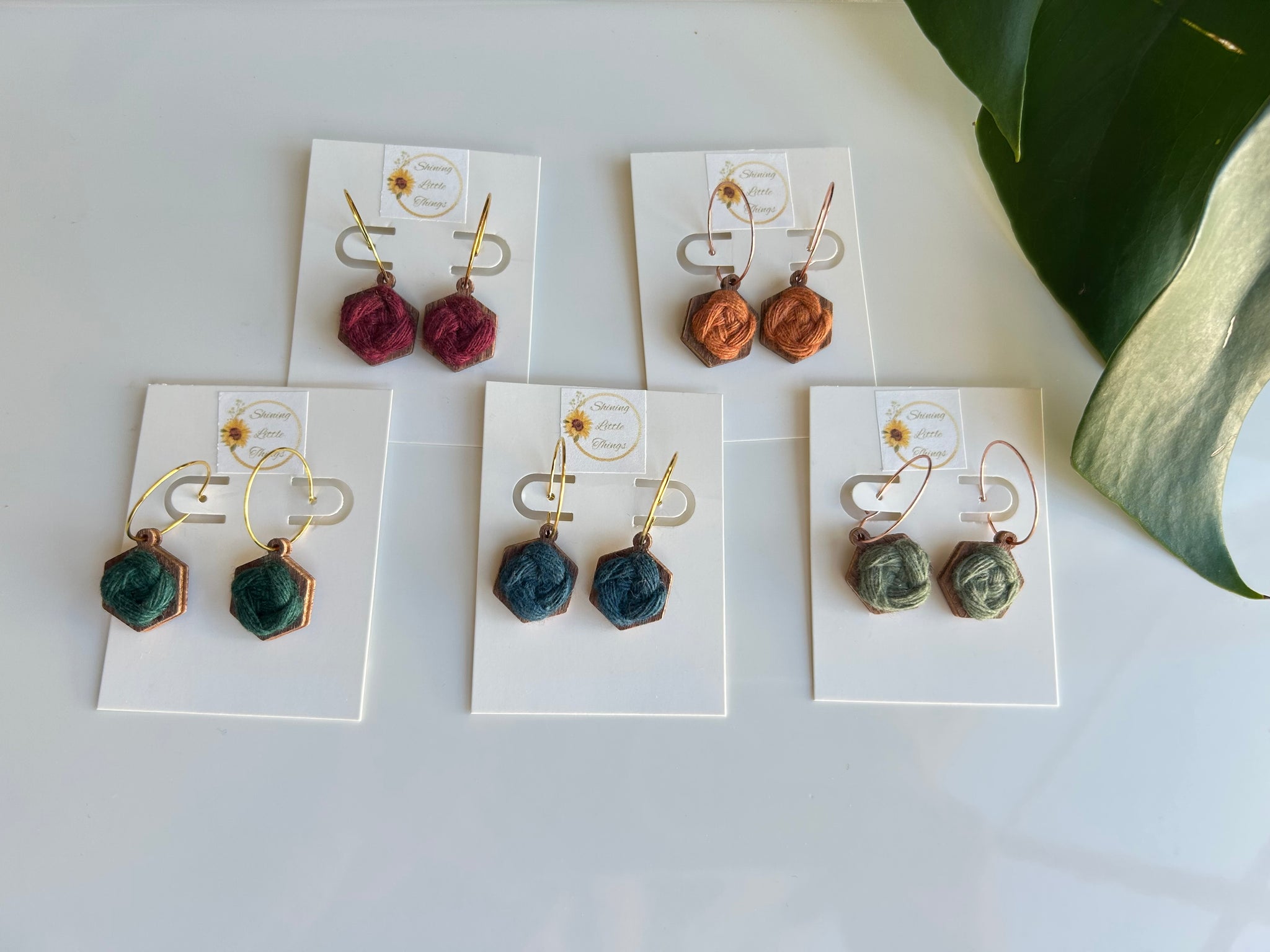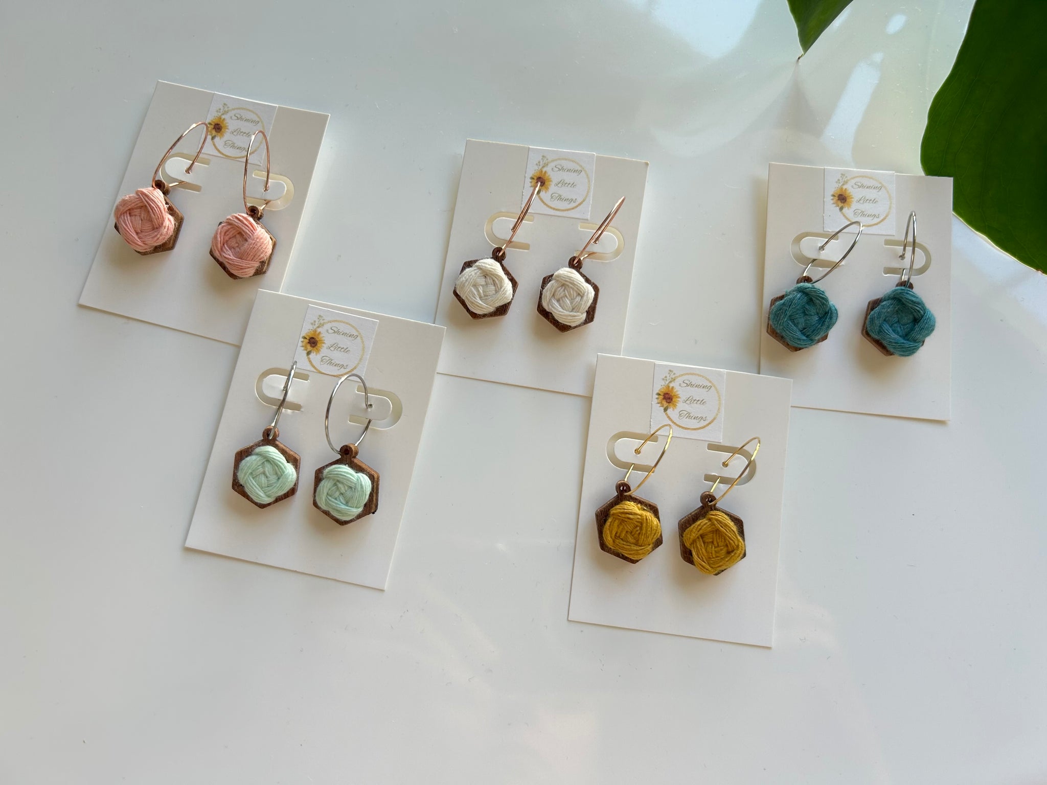 A unique small pop of color! Handcrafted & uniquely made for you. Ear findings nickel & lead free. Cotton cord; wood; silver/rhodium, 24k gold, & rose gold plated brass. Slight variations can occur due to handcrafting & cord, but I create with a perfectionist's attitude.