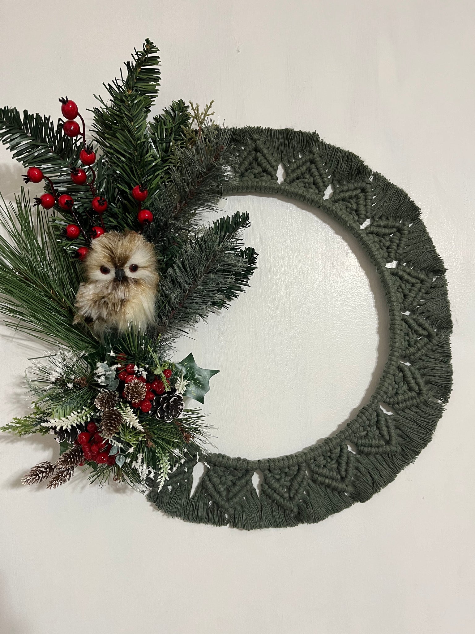 Holiday scene on any wall or door! Handcrafted, so each is made uniquely for you. Cotton cord; wood frame. Slight variations can occur due to handcrafting & cords, but I create with a perfectionist's attitude. Approx. 18in diameter w/fringe.