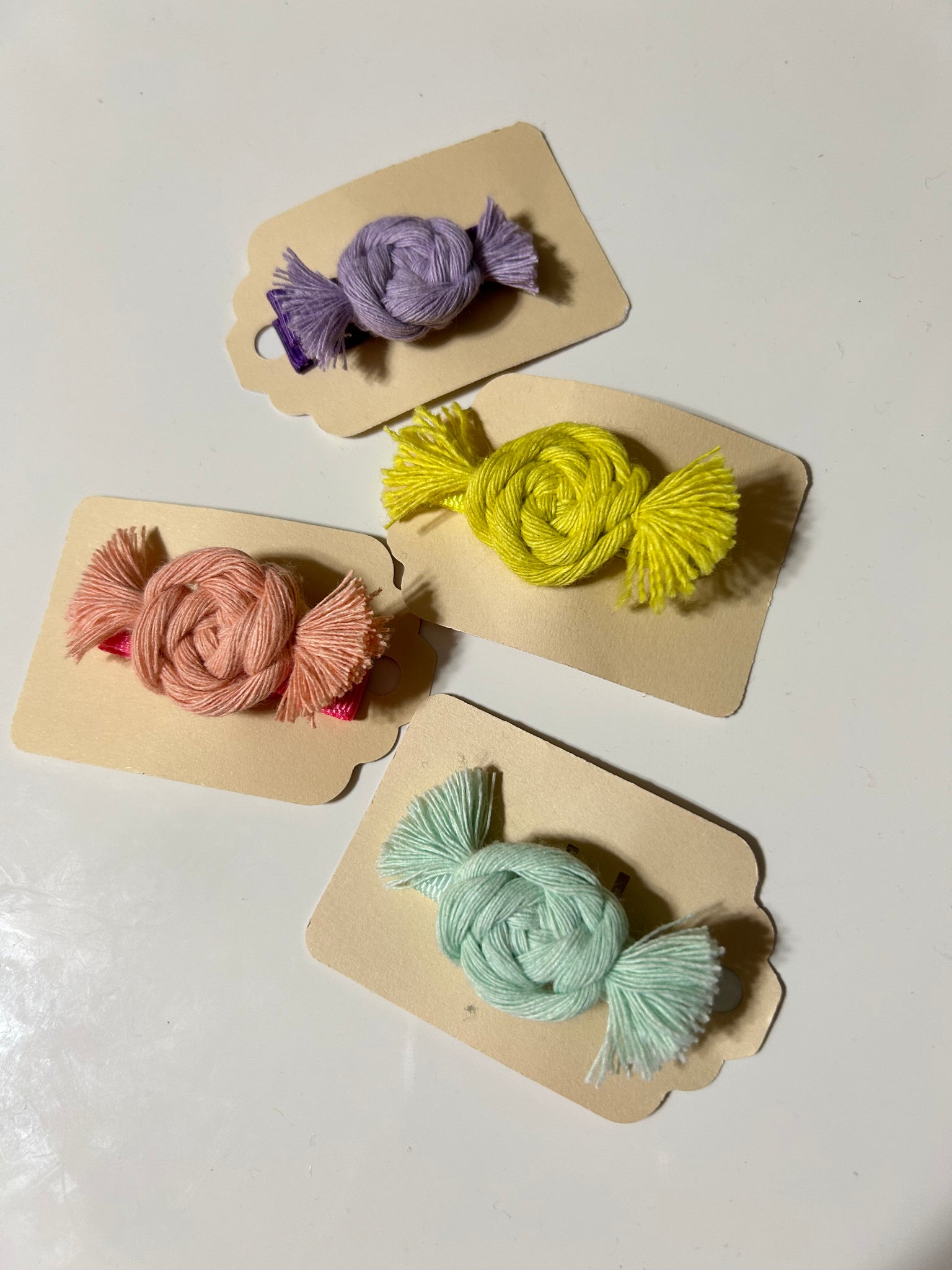 The cutest fringe for hair! Handcrafted & uniquely made for you. Cotton cord; ribbon covered hair clip. Slight variations can occur due to handcrafting & cord, but I create with a perfectionist's attitude.