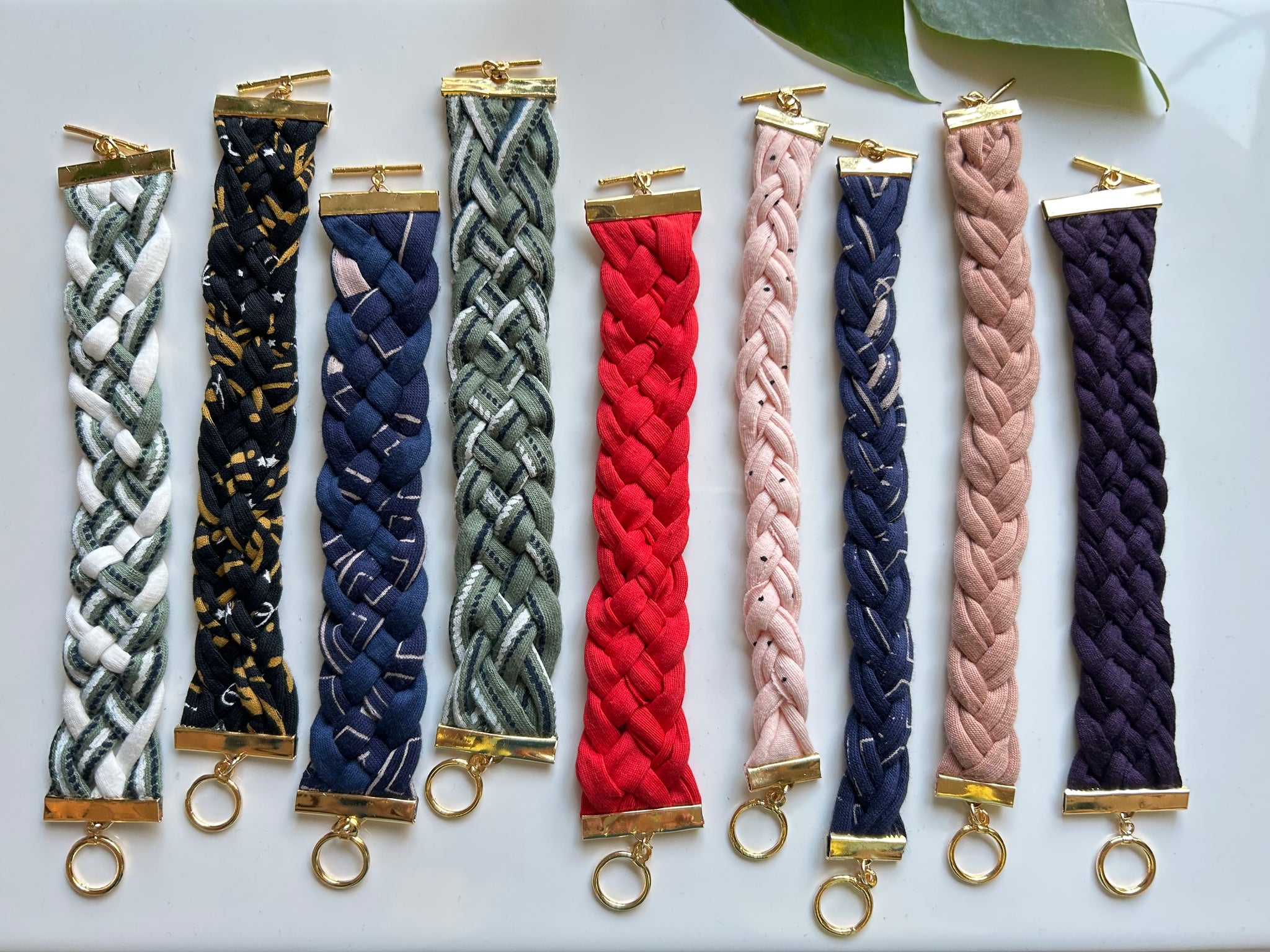 Braided beauty to accent any outfit! Handcrafted & uniquely made for you. Findings are 24K gold plated & 20mm or 30mm width. T-shirt cord. Slight variations can occur due to handcrafting & cord, but I create with a perfectionist's attitude.